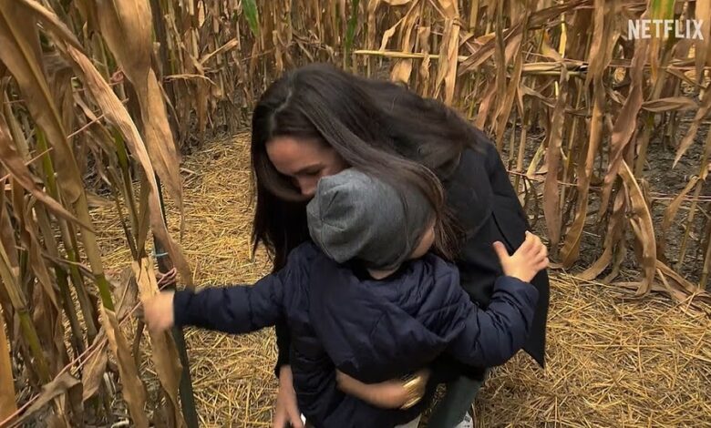 In Meghan’s video showing the family visiting a pumpkin patch near their California home, a grown-up Prince Archie, six, could be seen running through a corn field . The sweet footage was almost identical to clips the family had filmed three years earlier for the Netflix documentary in 2022, showing a much younger Archie running in a corn field. Archie, then three, had run around the field before reaching his mother’s arms, with Meghan lovingly scooping him up. Royal fans were left delighted by the parallel, with many rushing to exclaim how much Archie had ‘grown’ – and how much he now resembles his father, Prince Harry . One person gushed: ‘He’s such a big boy now!’ Others added: ‘Archie is literally a mini Harry down to the clothes’; ‘Look at how big our baby has grown’; ‘He’s close to being a young man. He’s going to be so tall just like Papa’; ‘Such a handsome young man!’