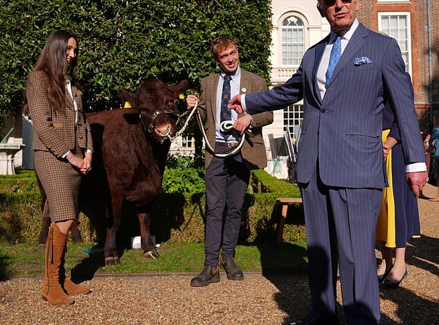 Charles beamed as he posed next to a pedigree Sussex beef cow during a reception for his charitable trust fund this afternoon