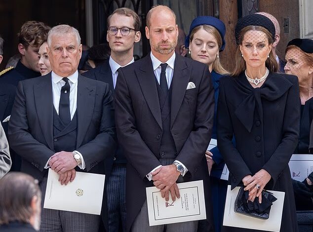Andrew Mountbatten Windsor is pictured with the Prince and Princess of Wales at the Duchess of Kent’s funeral in September – William was said to be ‘furious’ at his uncle’s unexpected appearance