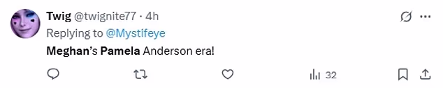 One comment on X read: ‘I think Meghan Markle was trying to be Pamela Anderson this time?!’