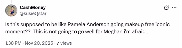 ‘Is this supposed to be like the Pamela Anderson going makeup-free iconic moment?’ one person wrote on X/Twitter. ‘This is not going to go well for Meghan, I’m afraid.’