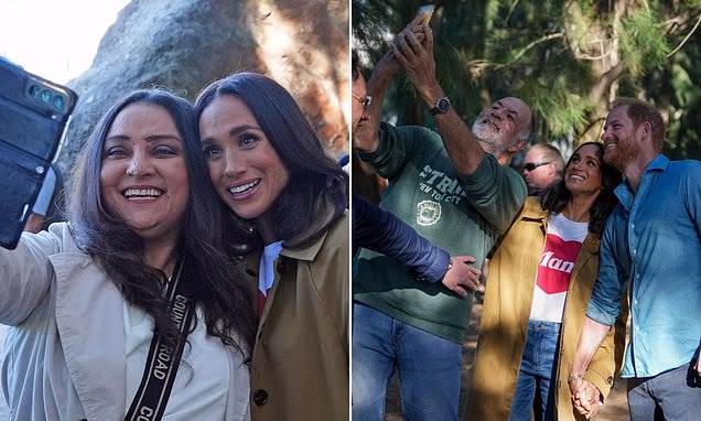 It culminated in an awkward moment between the reporter and the Prince on Thursday morning, who appeared to prod Dowsley out of the way of Meghan’s path as he tried to snap a selfie.