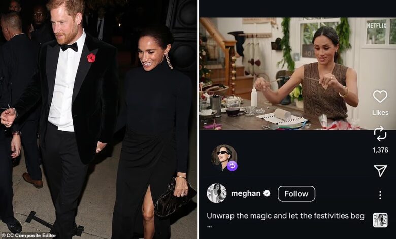 ‘I love the holiday season,’ Meghan says in a voiceover. ‘It’s about finding time to connect with the people we love, embracing traditions, and making new ones.’ The show, which sees her offer hosting tips while cooking with friends, was savaged by critics following its release in March but a second series came out in August. The latest development follows Jenner’s 70th birthday party being overshadowed by a mystery over why photos of Meghan and Harry were deleted from social media.