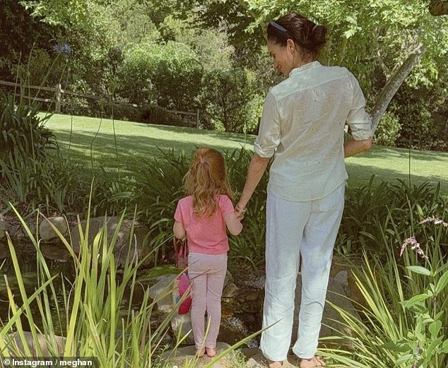 She sweetly wrapped her hands around Lilibet’s, as Meghan captioned the post: ‘Something is blooming. A new collaboration with @highcampgardenias arrives tomorrow.’