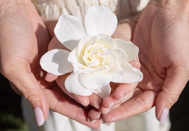 Meghan also shared a photo of herself, wearing a flowy white dress, while holding a vase of gardenias that covered her face.