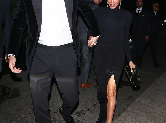 Among them was Adele, whose own reduced frame was on sizzling display as she emerged from her car wearing a brocaded black gown with lace sleeves