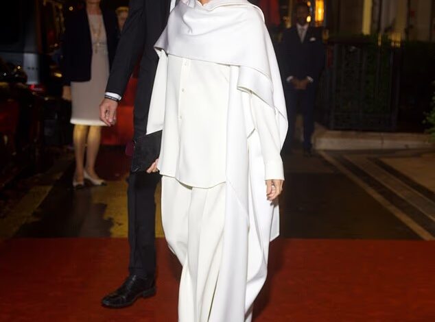 She was snapped wearing a stylish white oversized cape over a white button-down shirt with matching trousers.