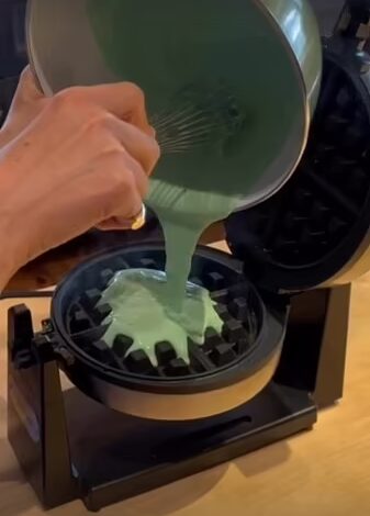 She filmed herself whisking up a vibrant mixture, before pouring it into a steaming hot black cast-iron waffle maker, before writing: ‘We love a theme!’