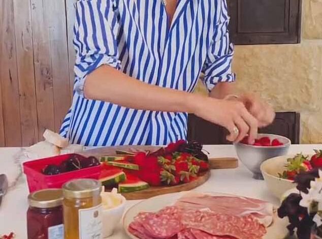 In the clip, Meghan introduced her board as ‘easy entertaining,’ and decorated a wooden platter with various fruits, cheeses, and crackers, as well as her sold-out, $14 As Ever raspberry spread.