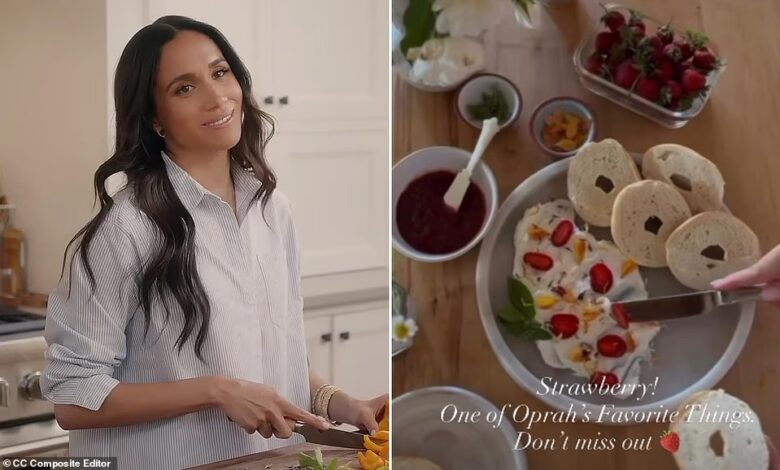 Meghan Markle has been accused of being ‘very inexperienced with cooking’ after sharing a ‘hack’ for eating bagels with cream cheese. The Duchess of Sussex , 44, took to Instagram on Monday to show how fans can use the $15 (£11) flower sprinkles from her lifestyle brand, As Ever, as part of a breakfast spread. Prince Harry ‘s wife shared a clip of herself scooping cream cheese onto a plate, before topping it with thinly-sliced strawberries and a selection of flower petals for ‘surprise and delight’.