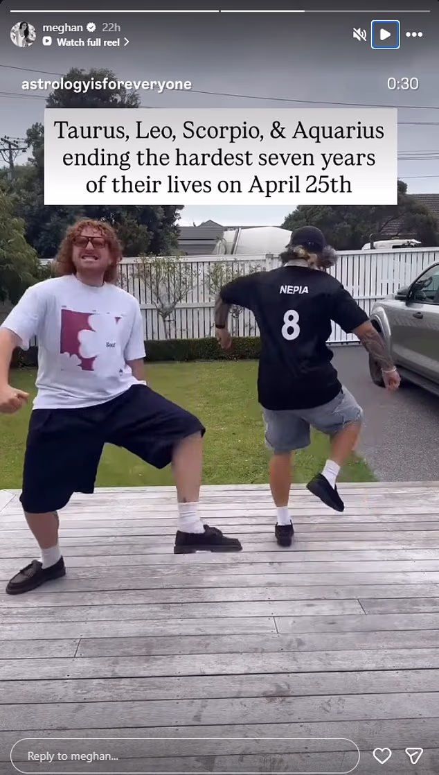 The Duchess reshared a video posted by a page called Astrology is for Everyone, which features two men dancing ecstatically.
