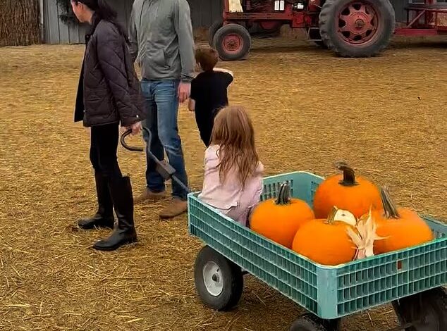 In footage shared to Instagram, the Duchess of Sussex, 44, was seen holding hands with Prince Harry and watching her children Archie, six, and Lilibet, four, exploring a field of pumpkins near their home in California.