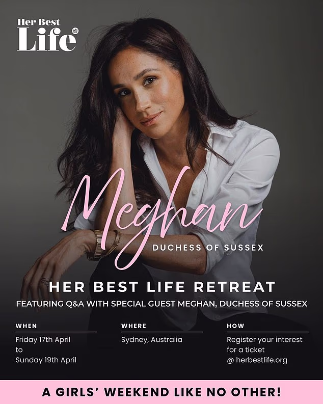 Meghan Markle will headline a £1,400 ($1.8k) ‘girls’ weekend’ in Australia, where she will deliver a gala dinner speech and pose for photos with VIP guests.