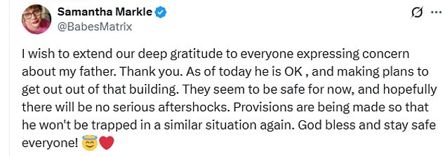 Samantha pointedly did not reveal whether the earthquake had damaged his apartment block, or how it had left him ‘trapped’.