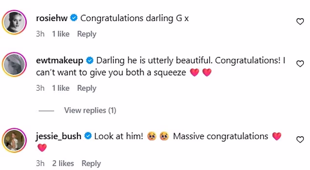 While others shared their congratulatory messages: ‘Darling he is utterly beautiful. Congratulations! I can’t wait to give you both a squeeze.’