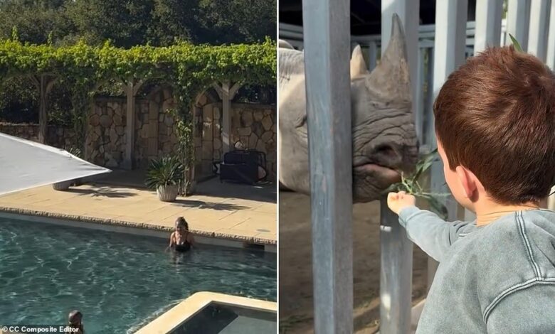 Meghan Markle has shared heartwarming footage of her children soaking up the sunshine in a swimming pool and feeding rhinos at the zoo. The sweet clips, uploaded to Instagram, show four-year-old Lilibet causing a splash in the water – accompanied by what appears to be Meghan’s mother, Doria Ragland. In one adorable video the back of six-year-old Archie’s red head is visible as he carefully feeds leaves to a critically endangered black rhino.