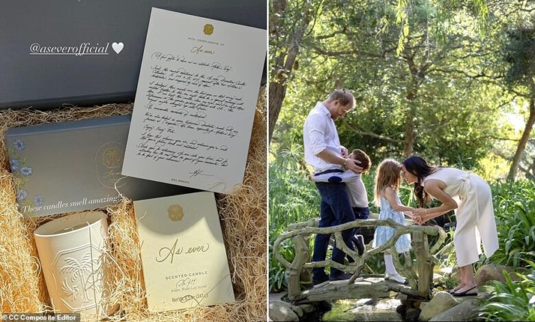 Meghan Markle is sending out As Ever gift boxes to influencers to promote the brand’s upcoming Mother’s Day collection – including the new £47 candles inspired by her children. Days after returning home to Montecito from her and Prince Harry’s divisive Australia tour, the Duchess of Sussex , 44, announced she had added two new candles to her lifestyle brand as part of a ‘Mother’s Day Edit’ on April 20. The marketing materials for the two candles mention Archie and Lilibet’s royal titles, as Meghan unveiled Signature Candle No. 506, named after her son’s birthdate of May 6, and Signature Candle No. 604, an homage to Princess Lilibet’s June 4 birthday.