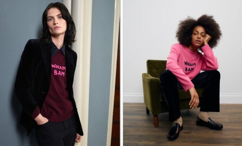The merino wool jumpers (90% merino wool and 10% cashmere) are available in pink and burgandy with the ‘Wham Bam’ lettering, while the 100% cashmere versions come in light grey and brown with ‘Kind!’ on them, and black and green with ‘Dance’ emblazoned.