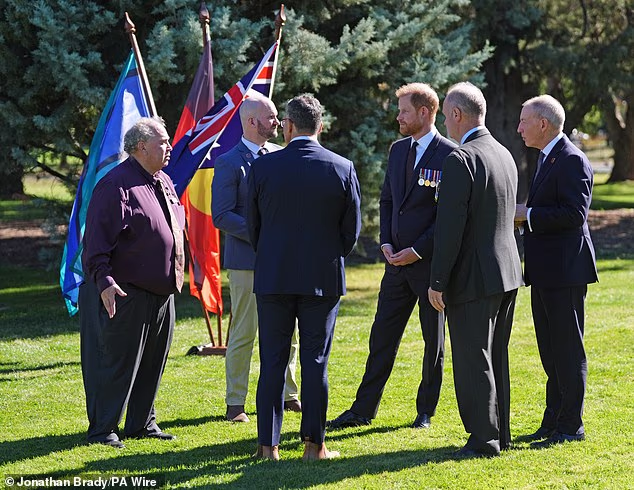 After being greeted by Indigenous veterans, Harry listened to a Welcome to Country address by the memorial’s Indigenous liaison officer Michael Bell, a Ngunnawal/Gomeroi man.
