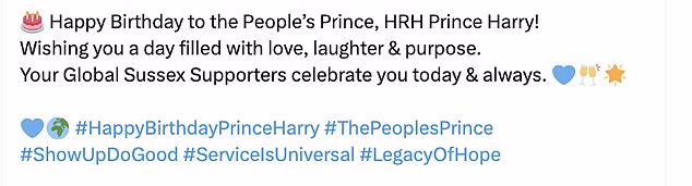 ‘Happy Birthday to the People’s Prince, HRH Prince Harry!’ another added. ‘Wishing you a day filled with love, laughter & purpose. Your Global Sussex Supporters celebrate you today and always.’