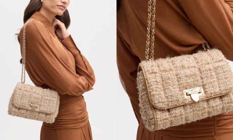 According to Aspinal, the Lottie handbag is handcrafted from full-grain leather and a woven wool blend boucle, a cosy-looking textured fabric made from looping yarn. Completing the look is the brand’s recognisable letterbox closure and a matching leather-plaited chain strap.