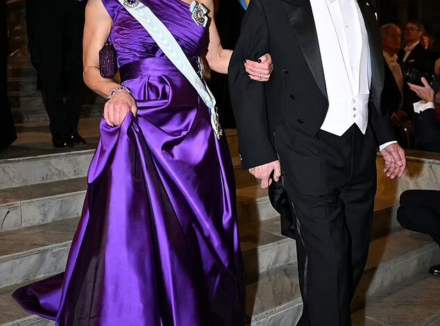 Purple reign! Crown Princess Victoria of Sweden enjoys a laugh with some of the world’s brightest minds at Nobel Prize banquet as she sports an opulent mauve gown