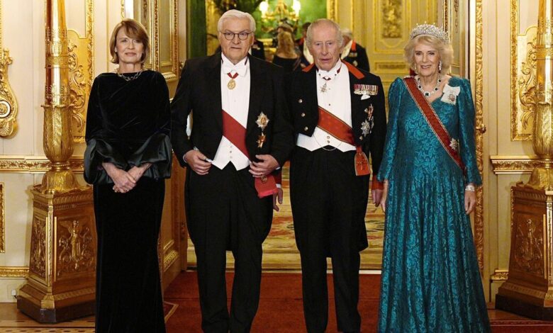 Earlier today, the Royal Family staged a grand welcome ceremony in the castle’s Quadrangle to greet their German guests after they arrived in the UK. For tonight’s banquet, the Queen, 78, showcased her trademark refined style, elevating her look with a dazzling selection of jewels.