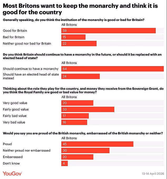 Almost half of all Britons (49%) are ‘proud’ of the institution and 59 per cent of people think the monarchy is good for the UK with just 15 per cent believing it is ‘bad for Britain’ – although this is up to 39 per cent among younger Brits under the age of 25.