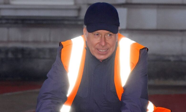 The 64-year-old, who is reportedly worth a whopping £30 million, pedalled through the palace gates wearing a high-visibility jacket over his suit.