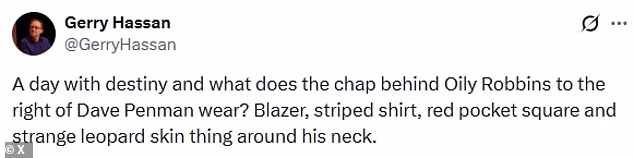Others were quick to point out his quirky attire, adding: ‘A day with destiny and what does the chap behind Olly Robbins to the right of Dave Penman wear?