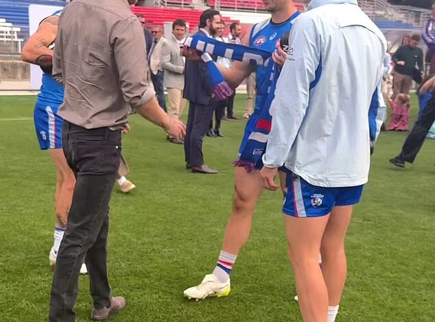 Western Bulldogs star Tom Liberatore (pictured, right) didn’t miss the opportunity to inform the Duke of Sussex that the Mona Castle Hotel – which the midfielder happens to co-own – is ‘just around the corner’