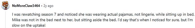The fan explained: ‘I was rewatching season seven [released from July 2017 to April 2018] and noticed she was wearing actual pajamas, not lingerie, while sitting up in bed.