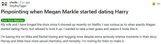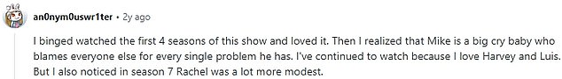 The viewer said, on discussion site Reddit: ‘I’m basing this on Mike and Rachel kissing and hugging once despite some seriously intense moments in their story.