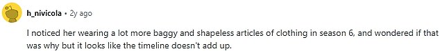 Similarly, one user commented: ‘I noticed her wearing a lot more baggy and shapeless articles of clothing in season six and wondered if that was why but it looks like the timeline doesn’t add up.’