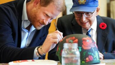 Touching scenes as Prince Harry meets some of Canada’s oldest veterans and kisses 91-year-old’s hand – as well as collecting yet another team’s baseball cap