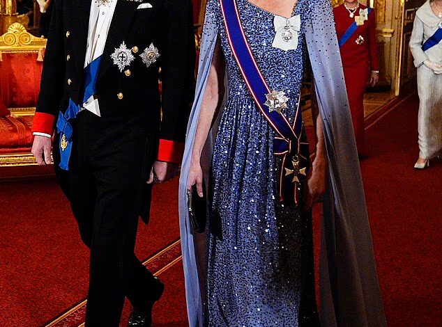 At a separate state banquet hosted for Donald and Melania Trump, she wore a couture Phillipa Lepley ensemble: a silk crepe gown layered beneath a hand-embroidered gold Chantilly lace coat.