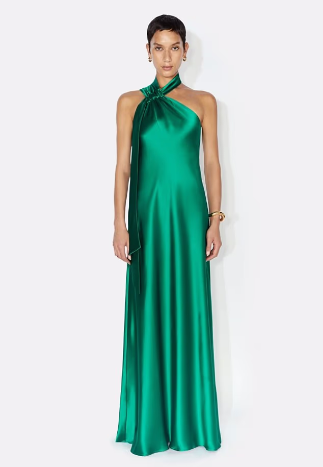 Crafted from lustrous bias-cut satin, the label’s Ushuaia gown features a sleek asymmetric halterneck, offering a modern twist on the timeless evening silhouette.