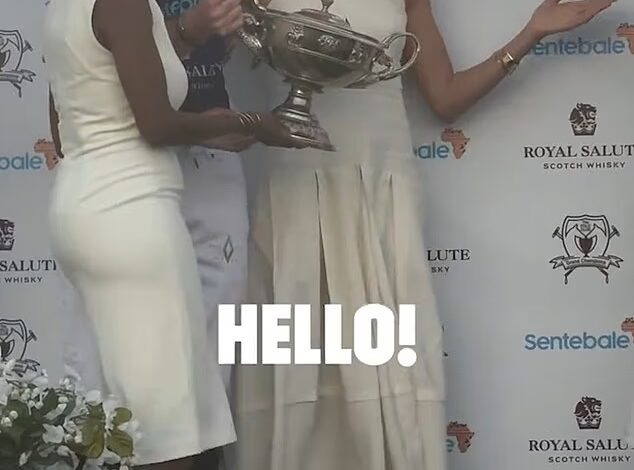 The new Hello! clip shows Meghan being helped on to a trailer to present a polo trophy to her British husband, giving him an affectionate kiss before giving him the silverware.