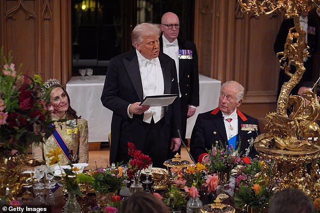 Mr Trump also claimed the King had helped wounded veterans ‘like nobody else’ during the glittering dinner at Windsor Castle for his second historic state visit.