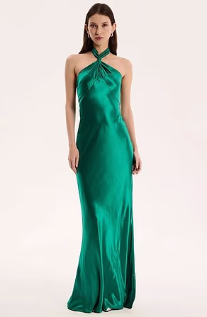 Cut in the same jewel-toned emerald satin, it beautifully skims the figure and captures the same understated glamour.